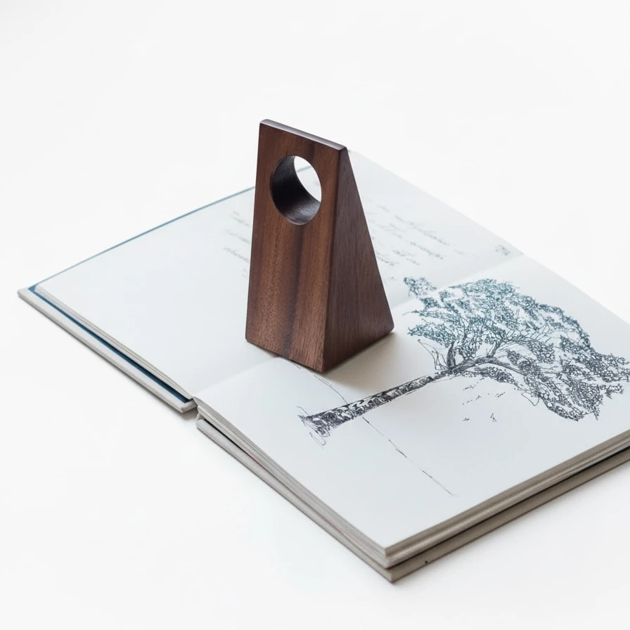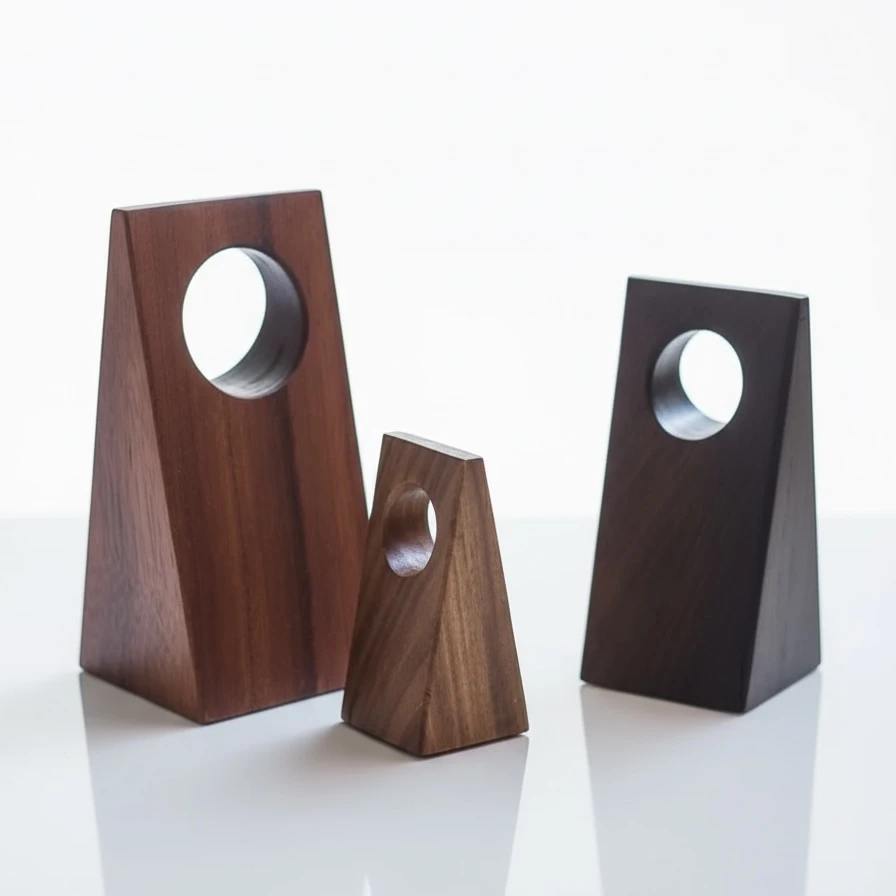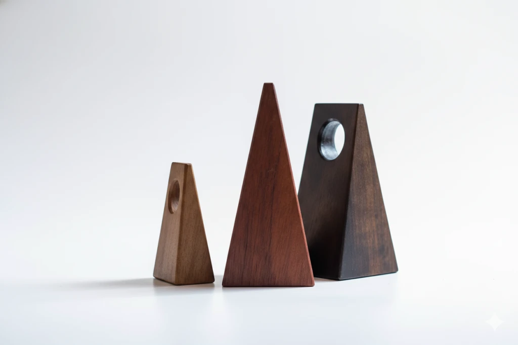 Conjunto de pesos de papel artesanais produzidos em madeiras maciças variadas, cada peça com tonalidade e veios únicos.