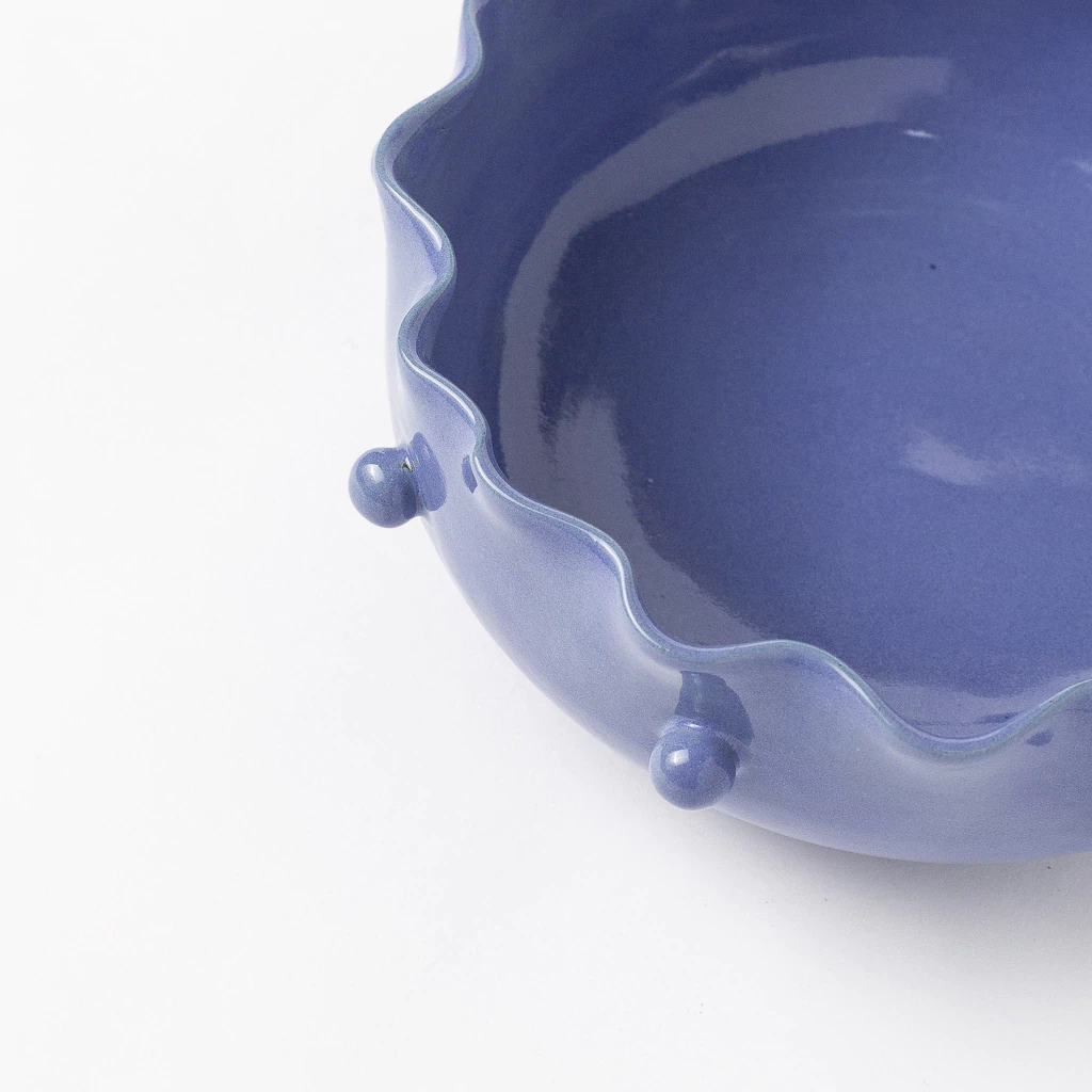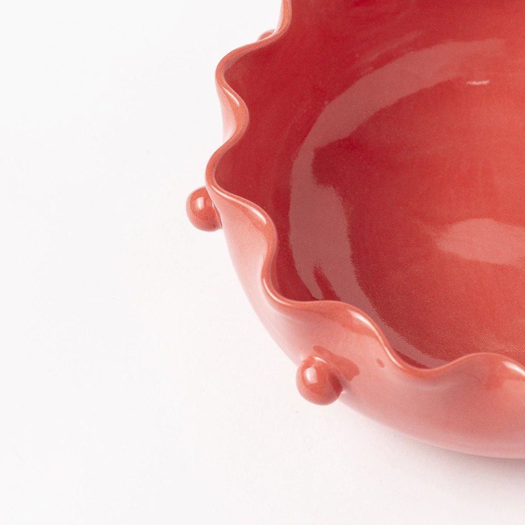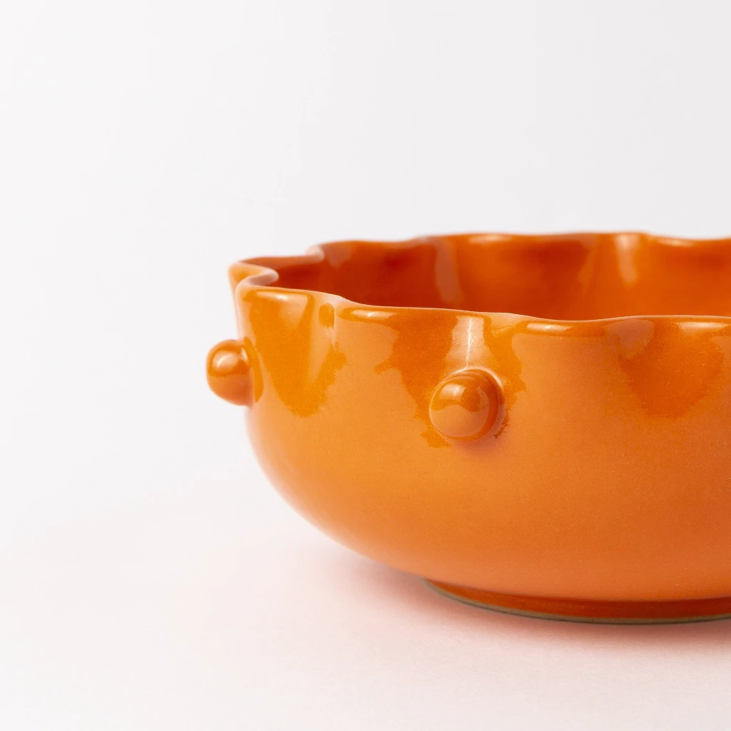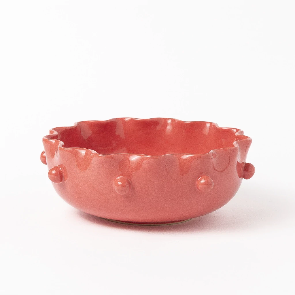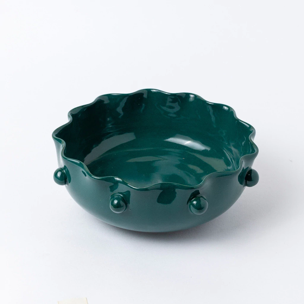Bowl em cerâmica queimado em alta temperatura, com borda ondulada e bolinhas esmaltadas na mesma cor. Peça artesanal feita à mão, que pode apresentar pequenas variações de forma, tamanho e tonalidade, resultado natural do processo de produção e das múltiplas queimas necessárias para o acabamento.