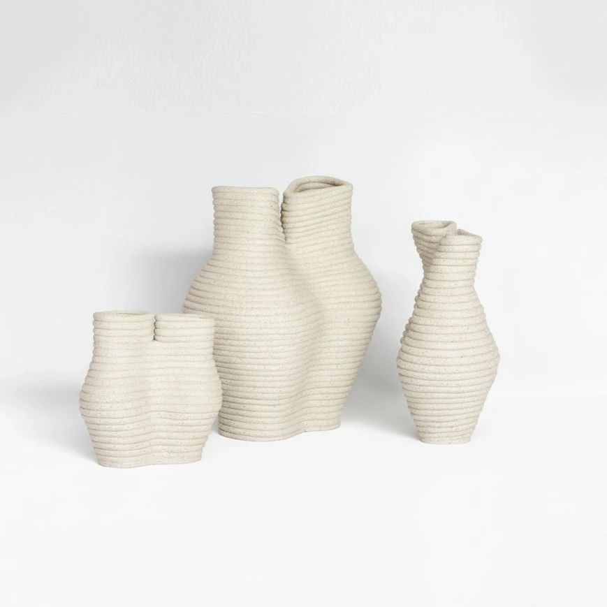 A escultura Ninho é desenvolvida com a técnica de acordelado a partir de camadas de vários fios de argila. Durante seu longo processo artesanal, linhas e curvas criam formatos que surgem do inconsciente do artista e da experimentação do seu processo criativo. Em um momento de muita presença e liberdade, temos peças únicas com formas singulares que somadas às texturas naturais da cerâmica compõem um objeto que ressoa a força da natureza através do seu design biofílico.