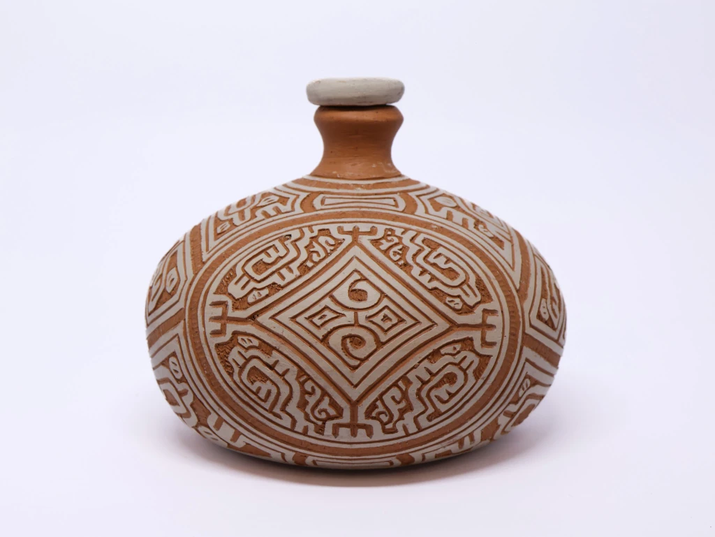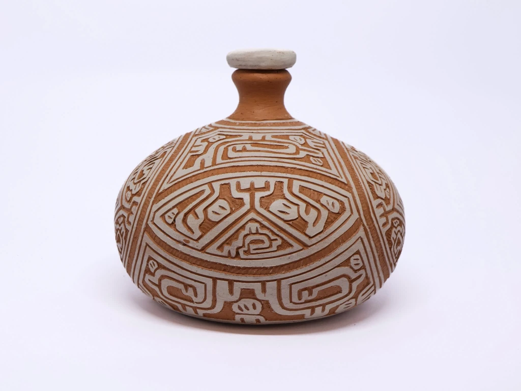 Peça artesanal produzida com barro da região da Ilha do Marajó e pigmentação natural de origem mineral. Os grafismos revelam traços da cultura e dos costumes dos antigos povos amazônicos, expressos em formas orgânicas que unem simplicidade e aconchego. O resultado é um objeto decorativo que integra ancestralidade e design contemporâneo.