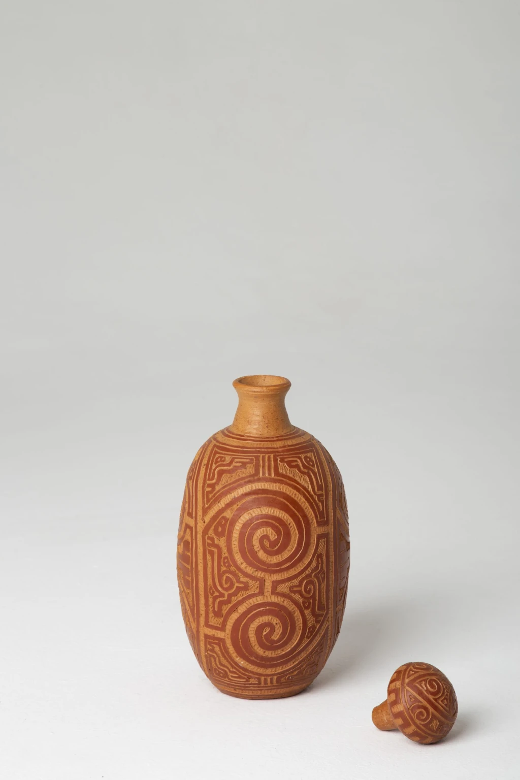 Peça artesanal produzida com barro da região da Ilha do Marajó e pigmentação natural de origem mineral. Os grafismos revelam traços da cultura e dos costumes dos antigos povos amazônicos, expressos em formas orgânicas que unem simplicidade e aconchego. O resultado é um objeto decorativo que integra ancestralidade e design contemporâneo.