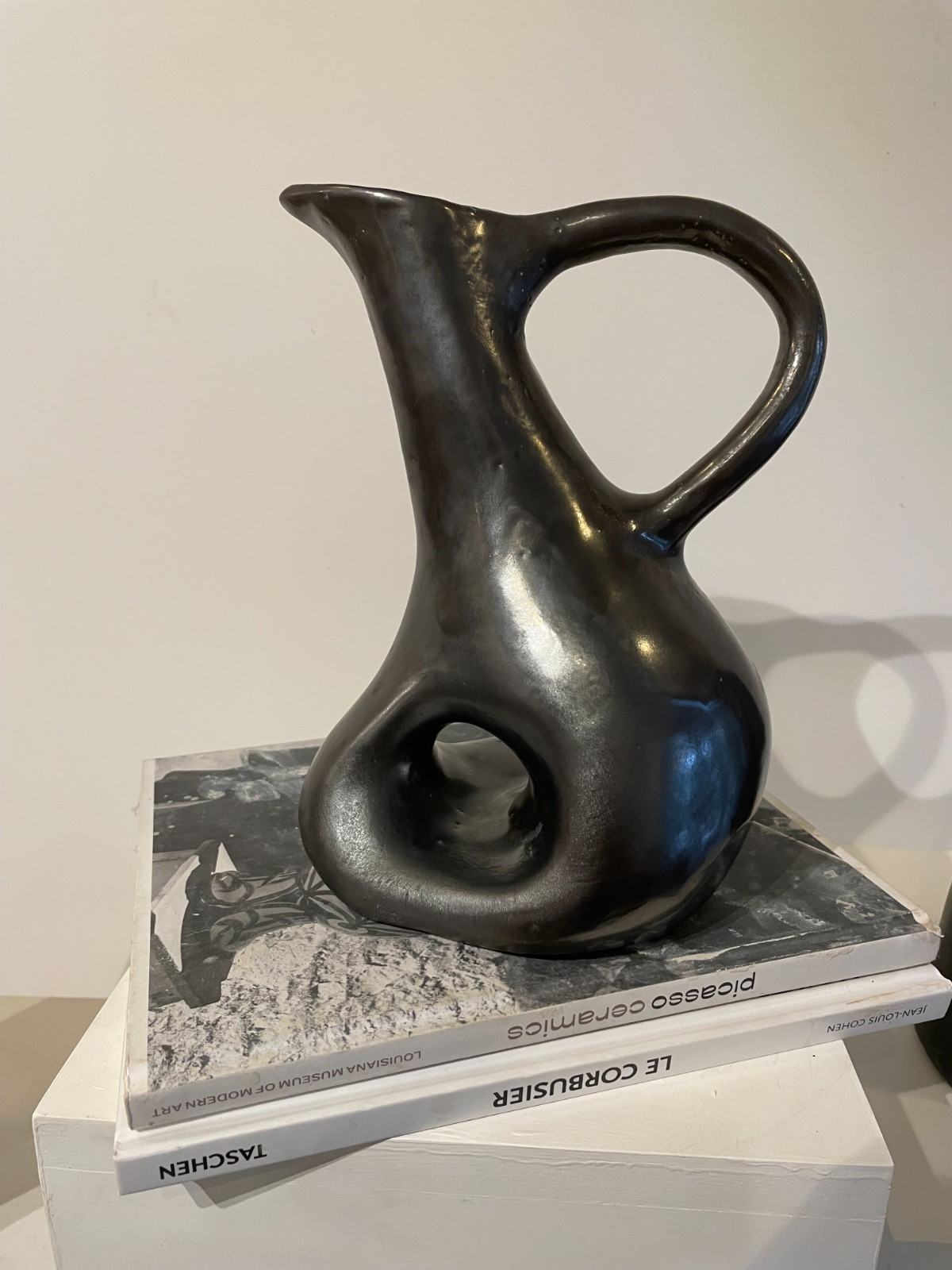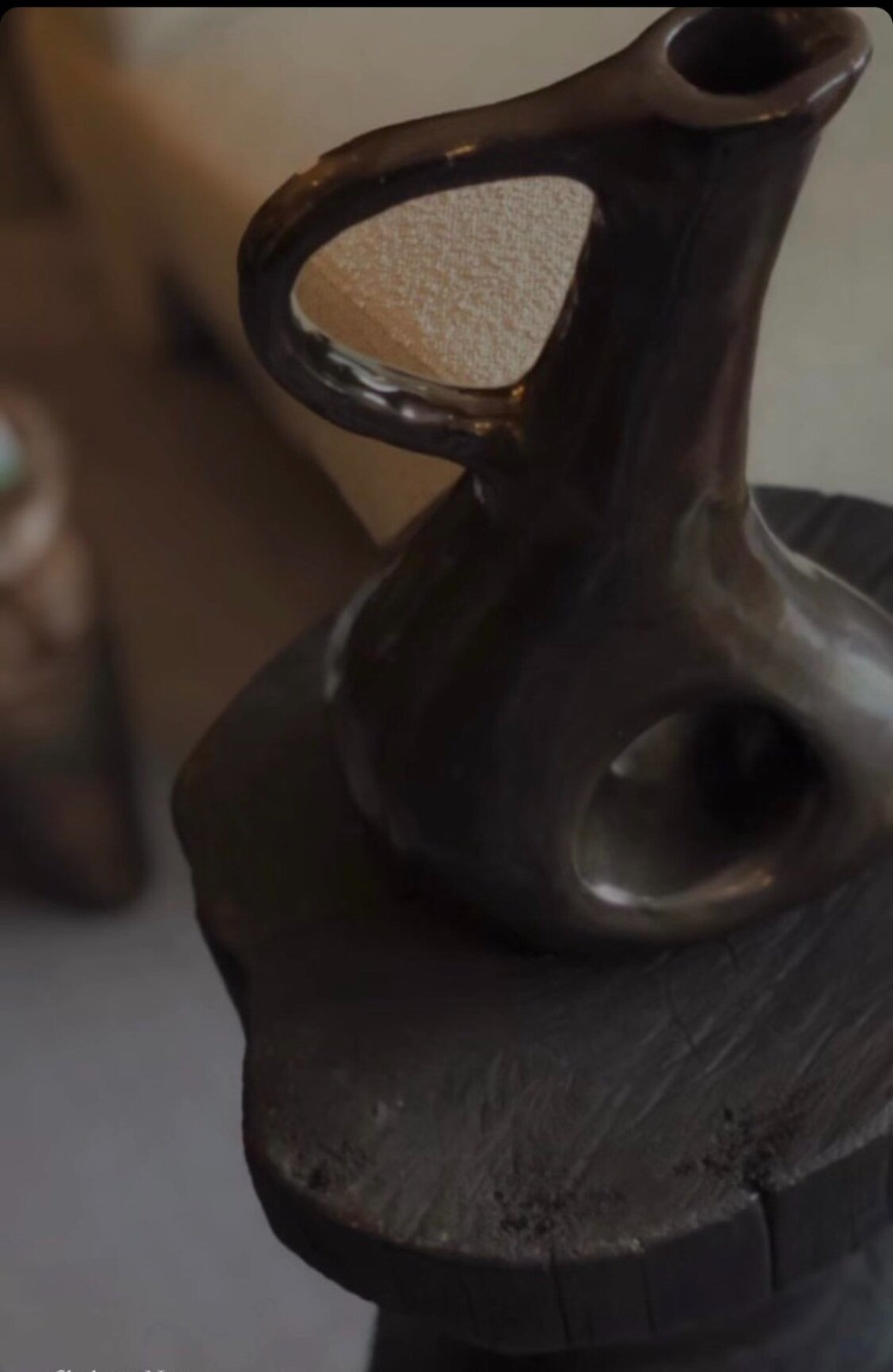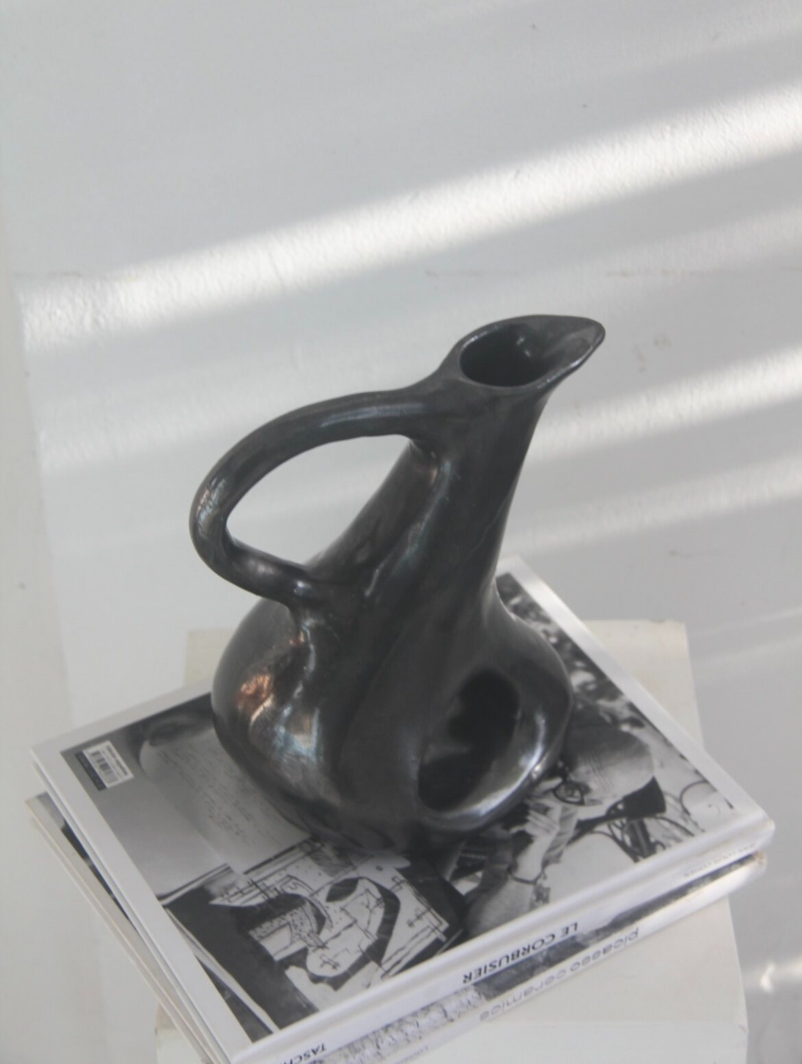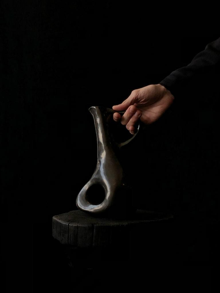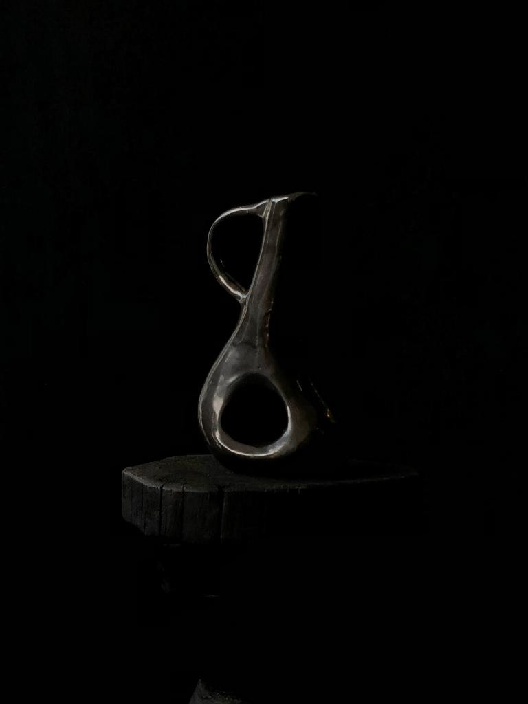 Jarro de cerâmica escultural utilitário feito à mão. Projetado para usar como um jarro ou um vaso ou ficar sozinho como um ponto focal escultural. Confeccionada em argila grés preta coberta por um lindo vidrado preto metalizado.Sobre a Série Biomórfica: A série incorpora abstração crua e orgânica. Esta abordagem inspira-se no design moderno de meados do século e nas formas orgânicas, mas arquitetônicas, encontrando inspiração na arquitetura orgânica de Savin Couelle e nos grandes escultores modernistas. A série Biomorphic consiste em uma variedade de vasos em diferentes formas, projetados para ganhar vida própria como vasos funcionais e objetos esculturais. Cada embarcação tem uma expressão única e é lentamente trabalhada à mão no estúdio de Hanna no Rio de Janeiro.