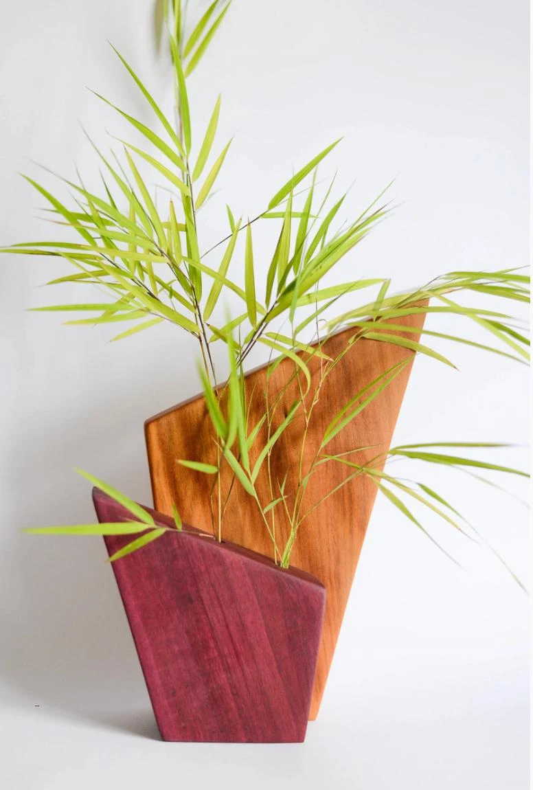 Vaso angular decorativo produzido o artesanalmente em madeiras nobres Peroba Mica e Roxinho.
