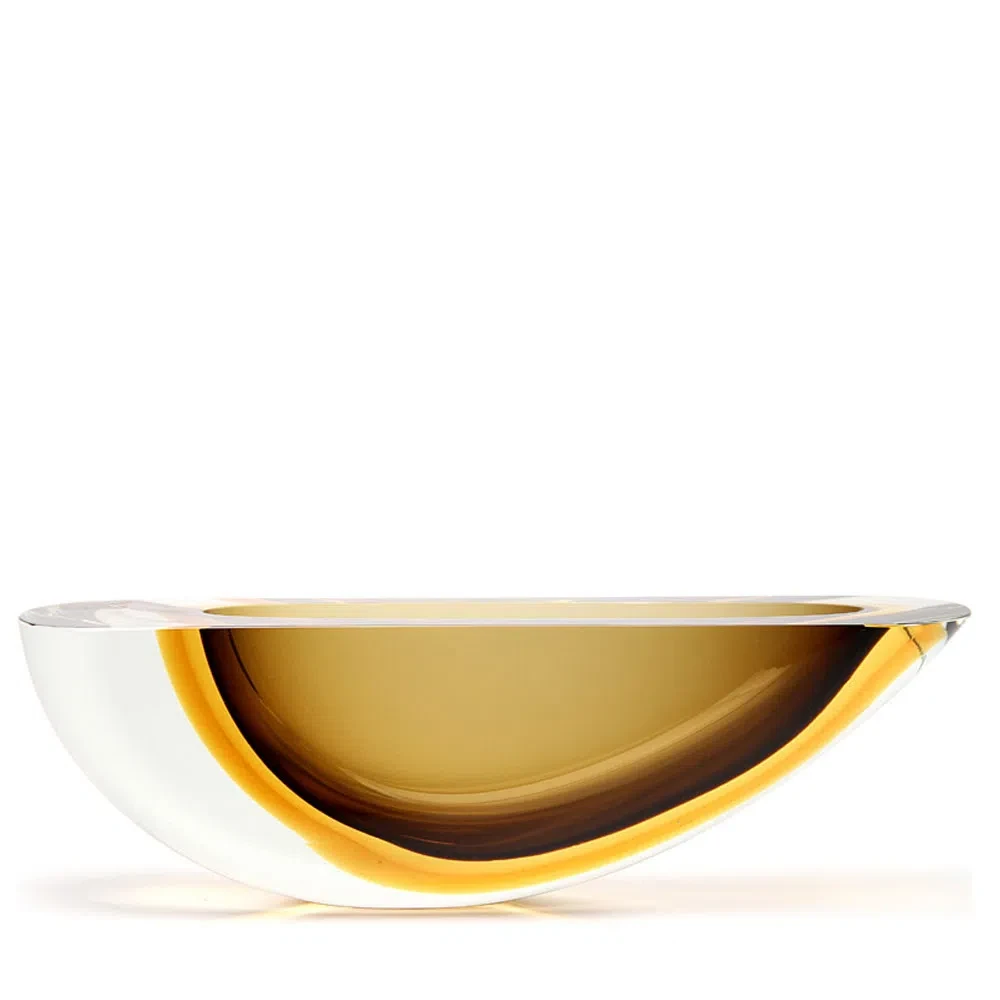 Canoa Bicolor em vidro fumê com âmbar. Peça artesanal produzida com a técnica do vidro soprado, que revela a fluidez e o brilho característicos desse material. O efeito bicolor é obtido pela sobreposição de camadas de vidro de diferentes tonalidades, criando profundidade e reflexos únicos. Com lapidação precisa e acabamento impecável, a peça expressa equilíbrio entre forma e transparência. Por ser feita manualmente, podem ocorrer pequenas variações de cor e proporção, tornando cada exemplar exclusivo.