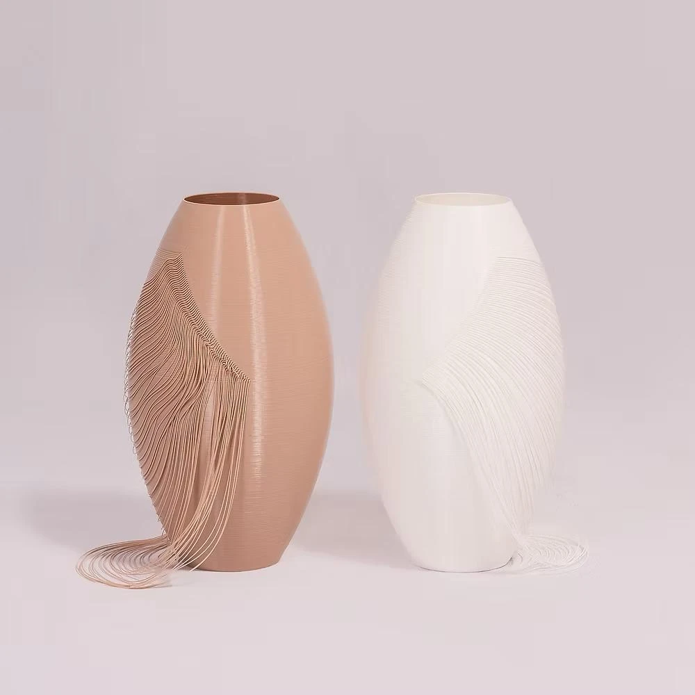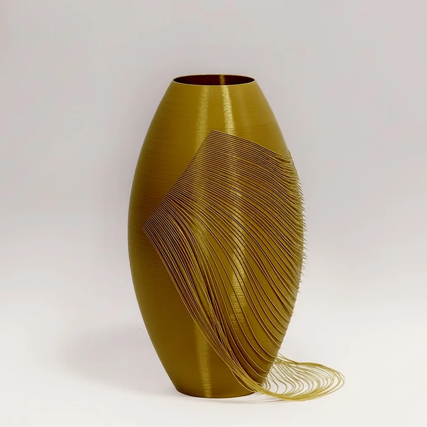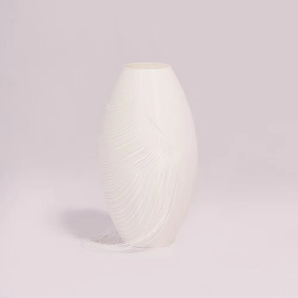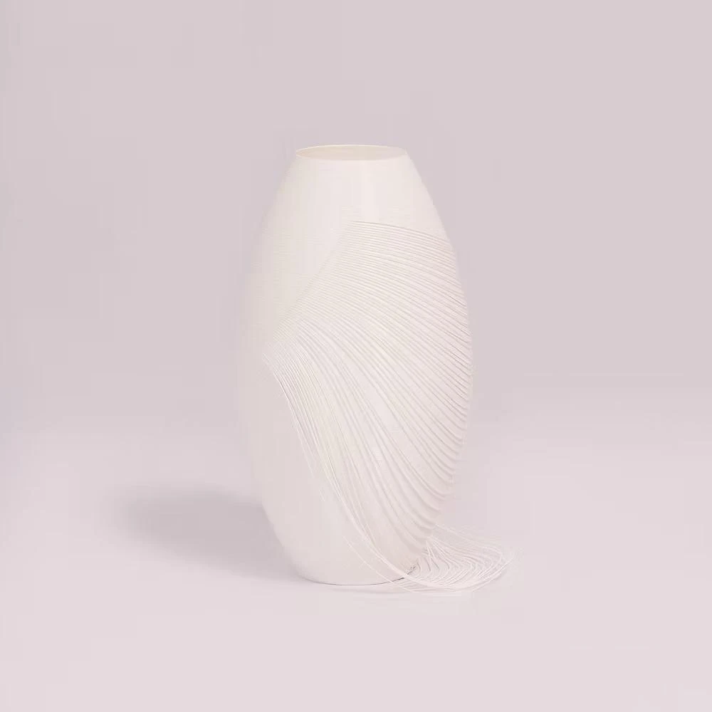 A coleção Desamparo nasceu da investigação das falhas da impressão 3D como linguagem estética, transformando erros em padrões únicos. O vaso V explora o fio em si, criando uma textura têxtil na aparência mas rígida na essência, delicada e caótica ao mesmo tempo, que repousa suavemente sobre a superfície como um tecido que se rende à gravidade. Peça impressa em 3D com PLA, um bioplástico feito de amido vegetal, reciclável e ecofriendly.