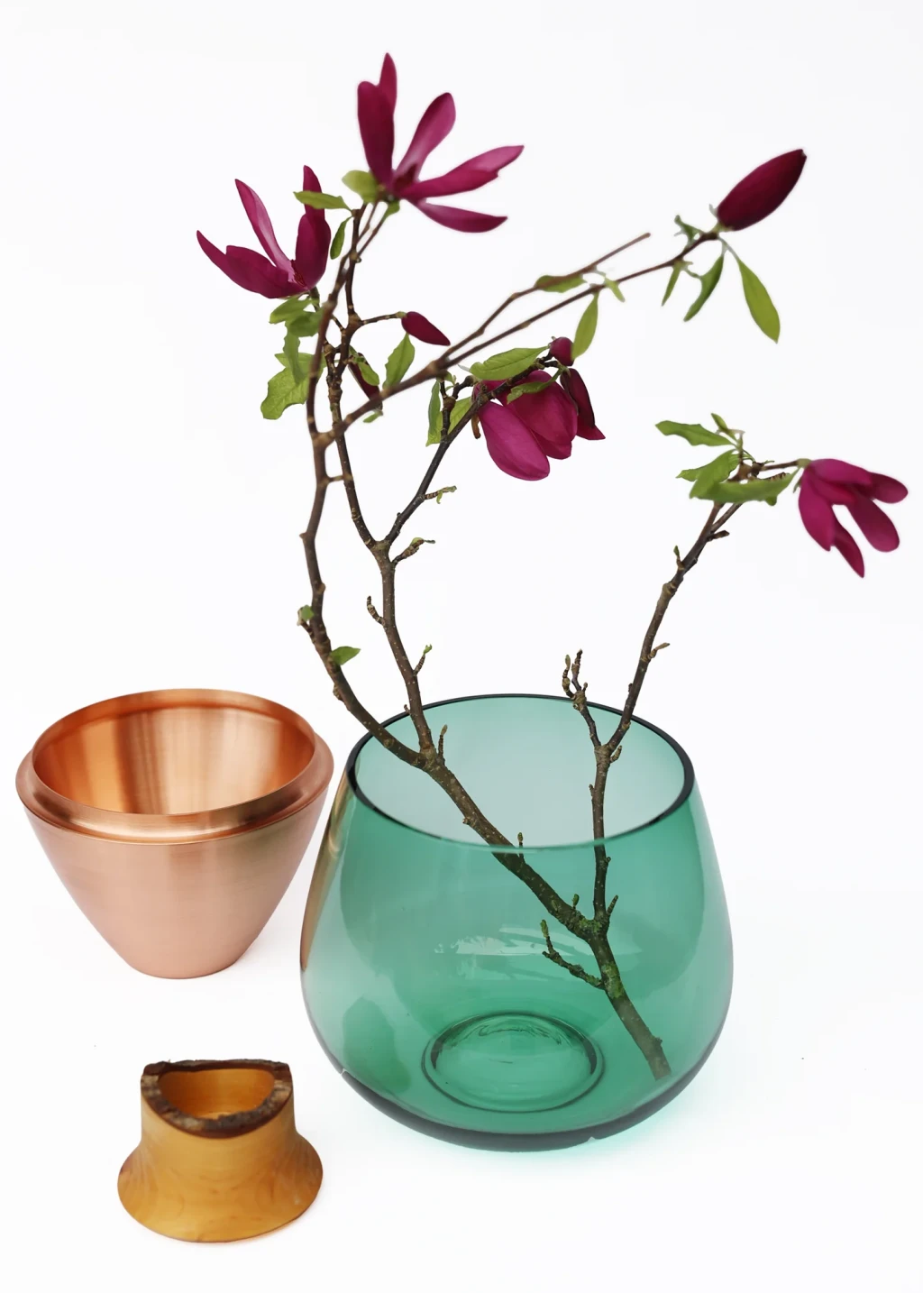 India I é um vaso artesanal que funciona como peça central em qualquer ambiente e combina metal semiprecioso moldado à mão na Grã Bretanha, vidro soprado na Tchéquia e madeira torneada na Finlândia, unindo técnicas tradicionais a um desenho contemporâneo com impacto visual e uso versátil; cada parte pode ser usada separadamente como vaso ou tigela e, após produzidos, os elementos seguem para a oficina no norte da Alemanha, onde são ajustados e montados manualmente para garantir equilíbrio e harmonia, resultando em um objeto que celebra o trabalho artesanal, a materialidade e o design atemporal.