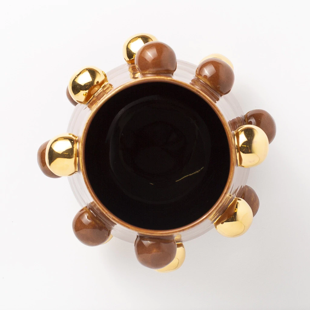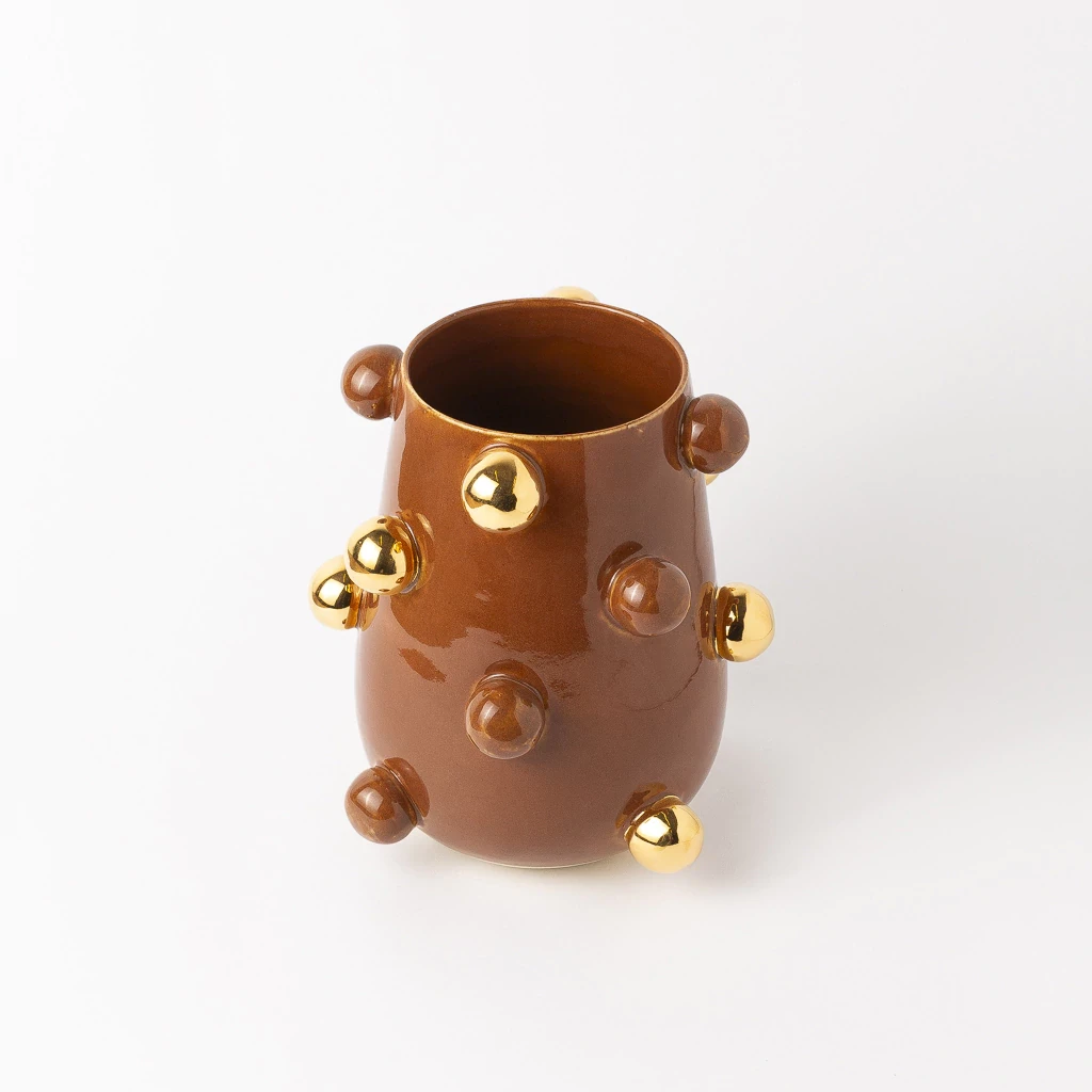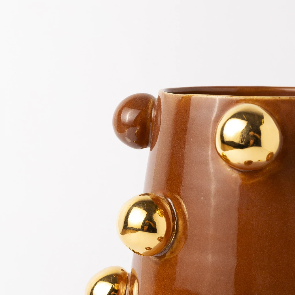 Vaso marrom com bolotas em ouro, produzido artesanalmente. Pode apresentar pequenas variações de forma, tamanho e esmaltação.