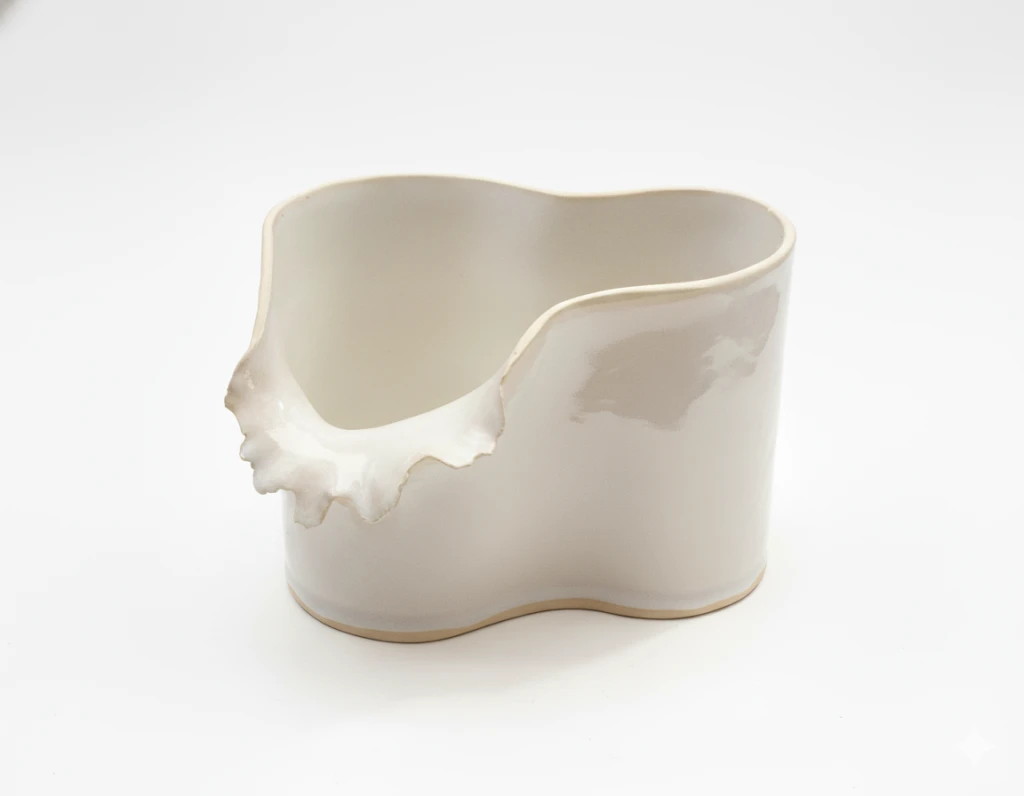 Vaso em cerâmica de acabamento natural, com formas orgânicas e contorno irregular que revela o encontro entre textura e fluidez. O interior esmaltado contrasta com o exterior fosco, criando uma peça que combina sutileza e presença. Por ser modelado e finalizado manualmente, cada vaso apresenta pequenas variações de cor e forma, características que tornam cada exemplar único. Ideal para composições contemporâneas ou como destaque isolado em ambientes minimalistas.