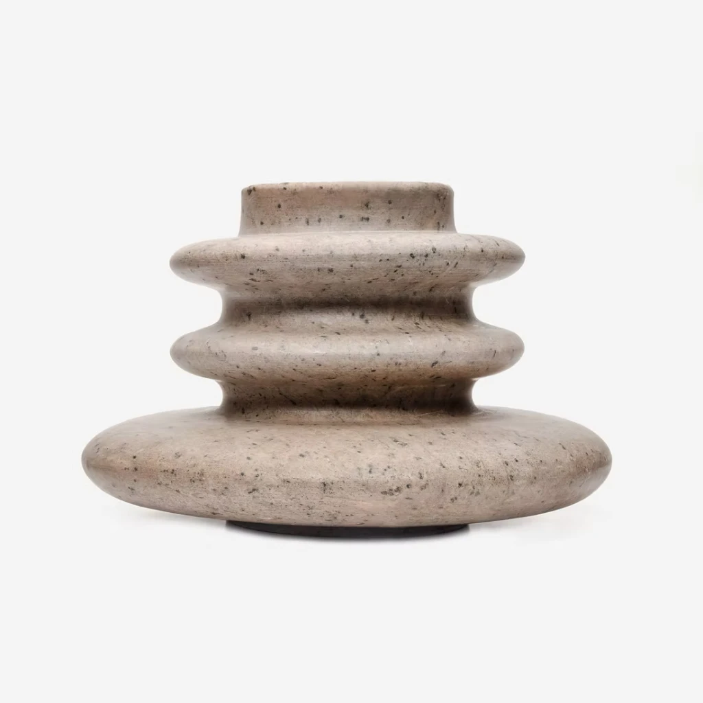 Vaso esculpido em pedra-sabão, com design geométrico que valoriza a união entre linhas simples e proporções equilibradas. A rocha natural apresenta variações de tonalidade que vão do rosado ao acinzentado, tornando cada peça única. Produzido artesanalmente, o vaso destaca a textura e o brilho sutil do material, revelando o encontro entre forma, matéria e movimento.