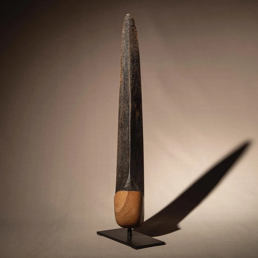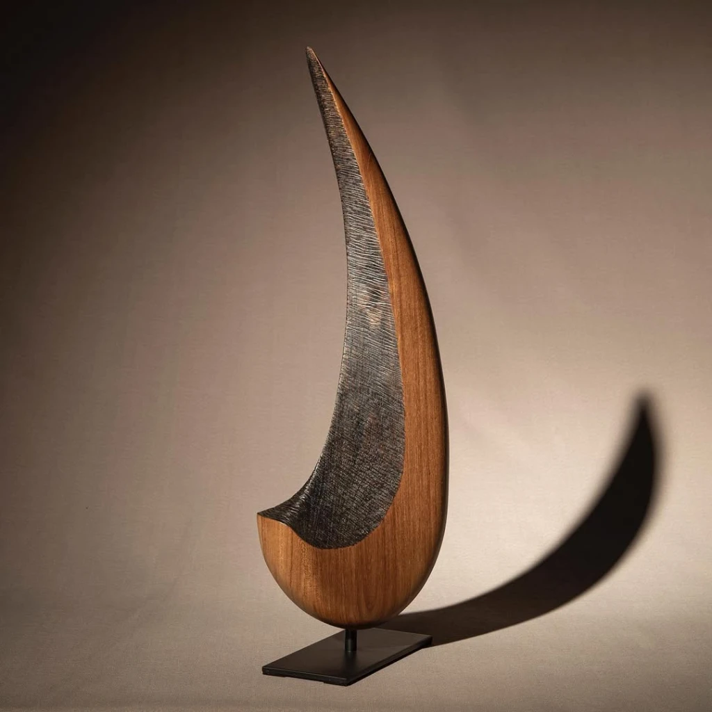 Esta peça apresenta um design inspirado em uma vela náutica, unindo a sofisticação da madeira polida com uma textura interna rugosa e escura. Com linhas minimalistas que evocam o movimento do vento, ela é o elemento ideal para trazer um toque artístico e orgânico à decoração.