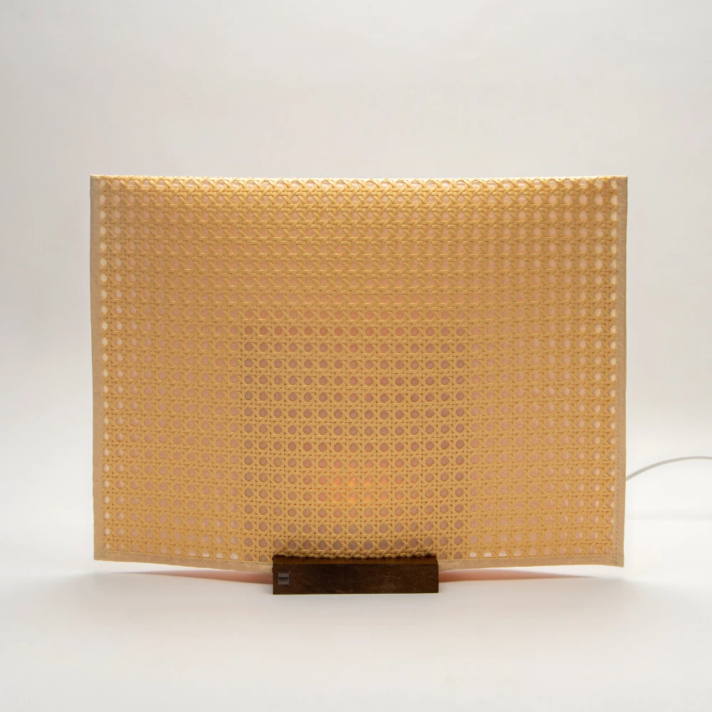 Luminária Decô 2025 em seda e celulose com estrutura em madeira e bambu. A peça difunde a luz de forma suave, criando iluminação quente e uniforme. Equipada com lâmpada LED bivolt 05W.