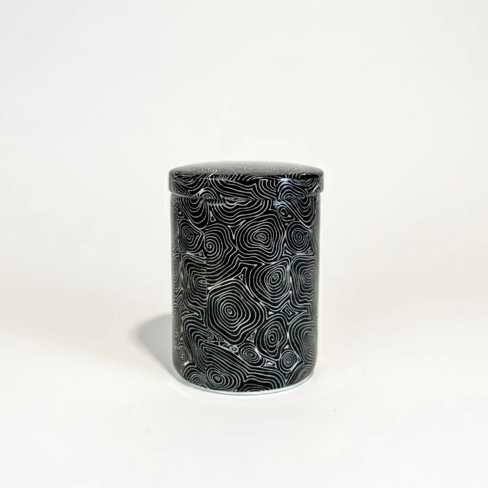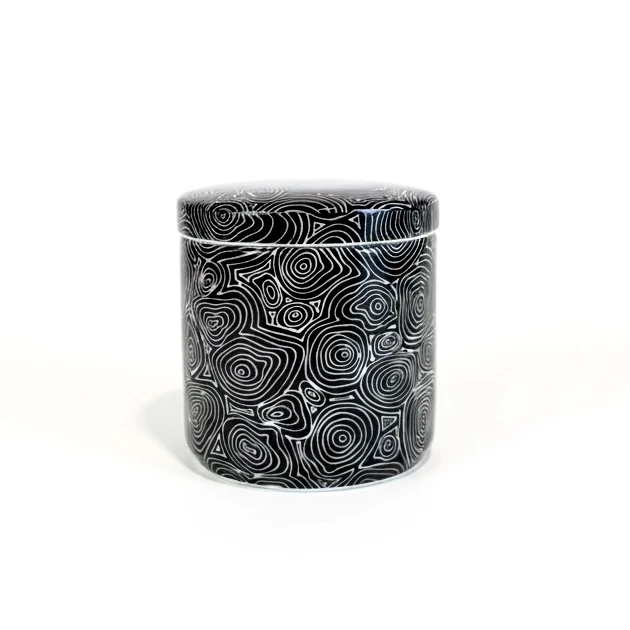 Pote em cerâmica com textura artesanal em relevo, apresentando padrões orgânicos e fluidos em preto com detalhes em branco. Peça multiuso que pode ser utilizada como porta-velas, porta-objetos ou elemento decorativo. Tampa removível que oferece versatilidade de uso. Disponível em dois tamanhos: maior (10 x 12 x 12 cm) e menor (9,5 x 10 x 10 cm). Vendidos separadamente. Produzido artesanalmente, cada peça possui características únicas devido ao processo manual de confecção e aplicação da textura.