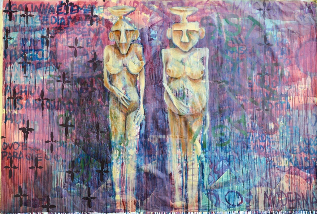 Acrílico, papel jornal e bastão de óleo s/ tela
