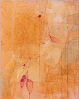 Acrílica, lápis e colagem de organza de seda sobre tela