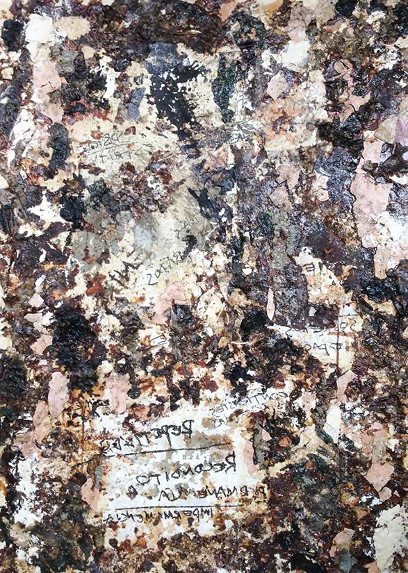 desenho, inscrição, monotipia, impressão, incisão, ponta seca, cola, seladora, betume, oxidação, casca de muro sobre tela