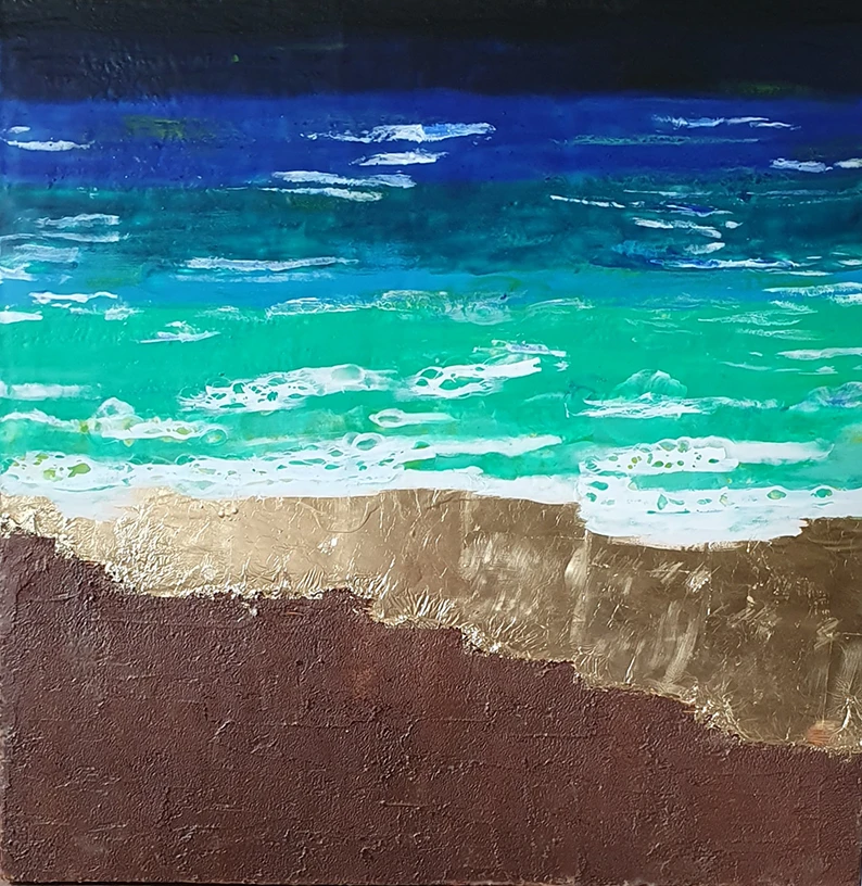 Encáustica com pimentos e folha de ouro e terra de formiga sobre madeira