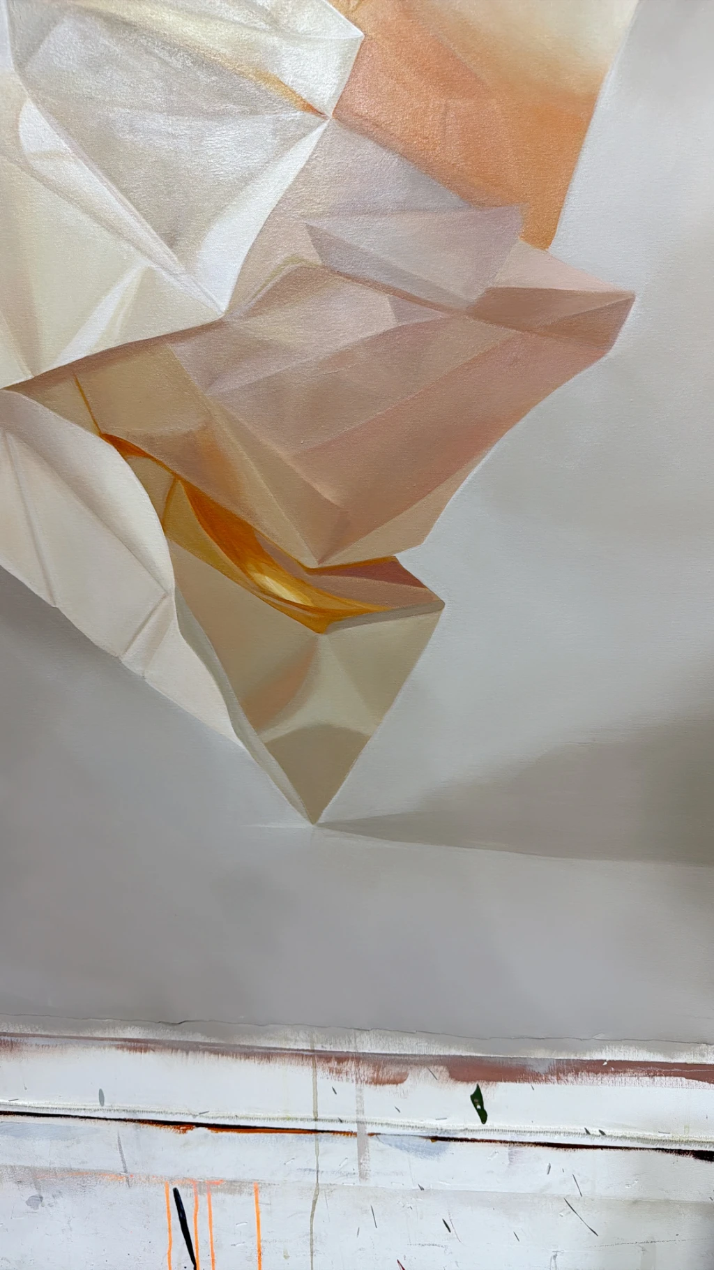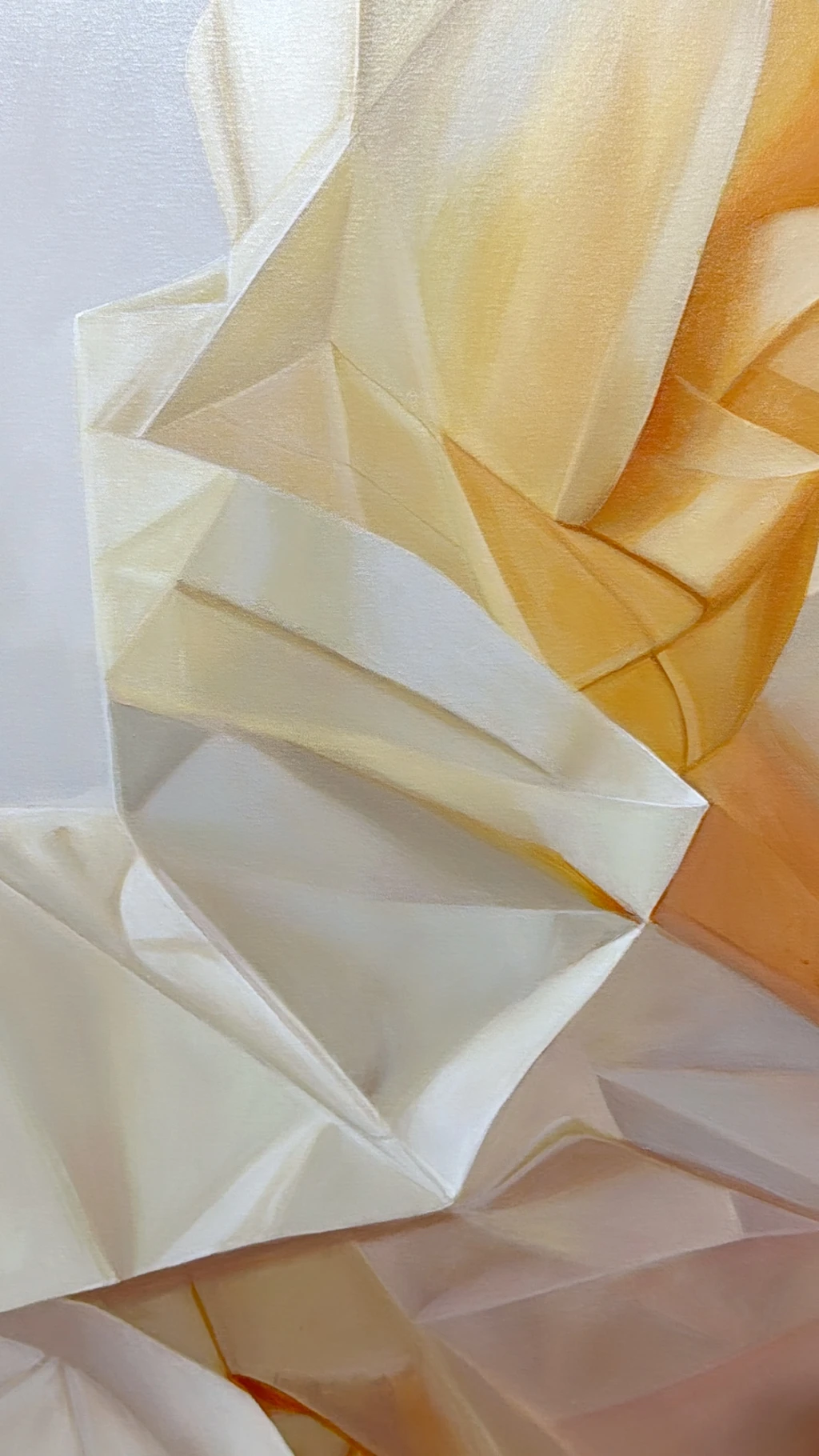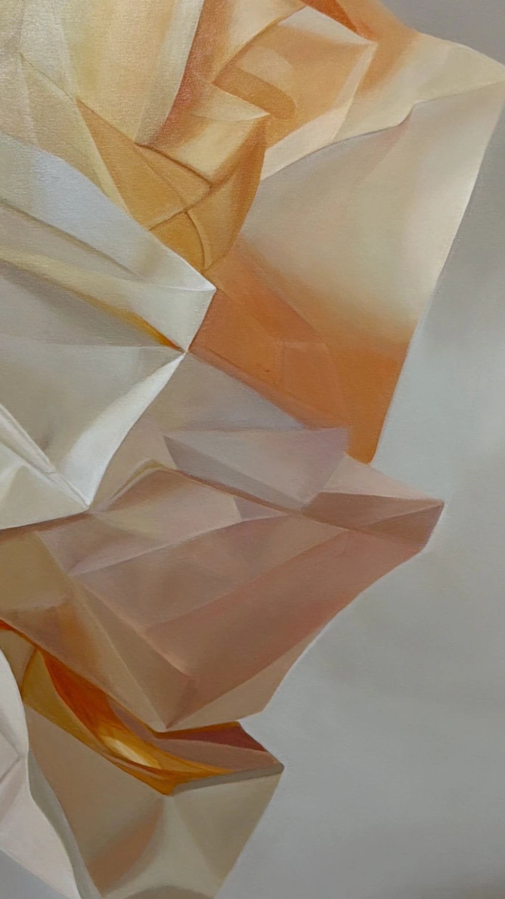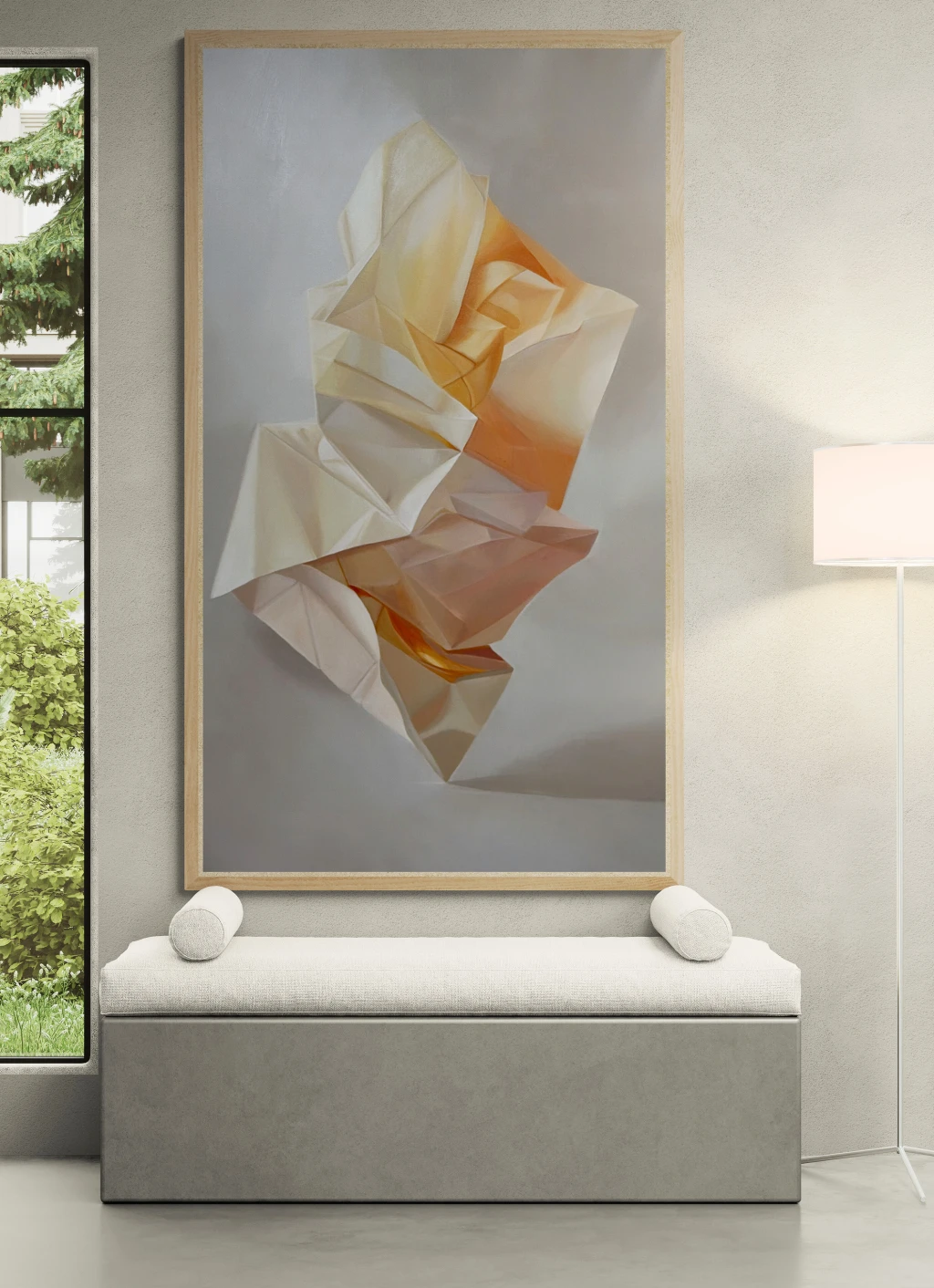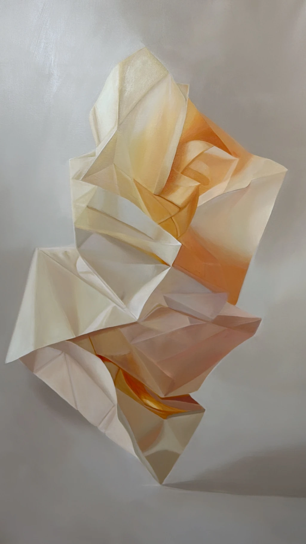 Inspirada na delicada estrutura do papel dobrado, esta obra sugere a presença de uma rosa sem descrevê-la de forma literal. Brancos suaves, cremes quentes e tons sutis de laranja criam um brilho interno silencioso, conferindo à forma uma sensação de intimidade e calma.