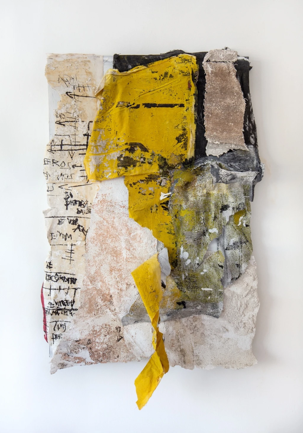Tinta, décollage e monotipia sobre tecido sobre tela, montado sobre chassi.