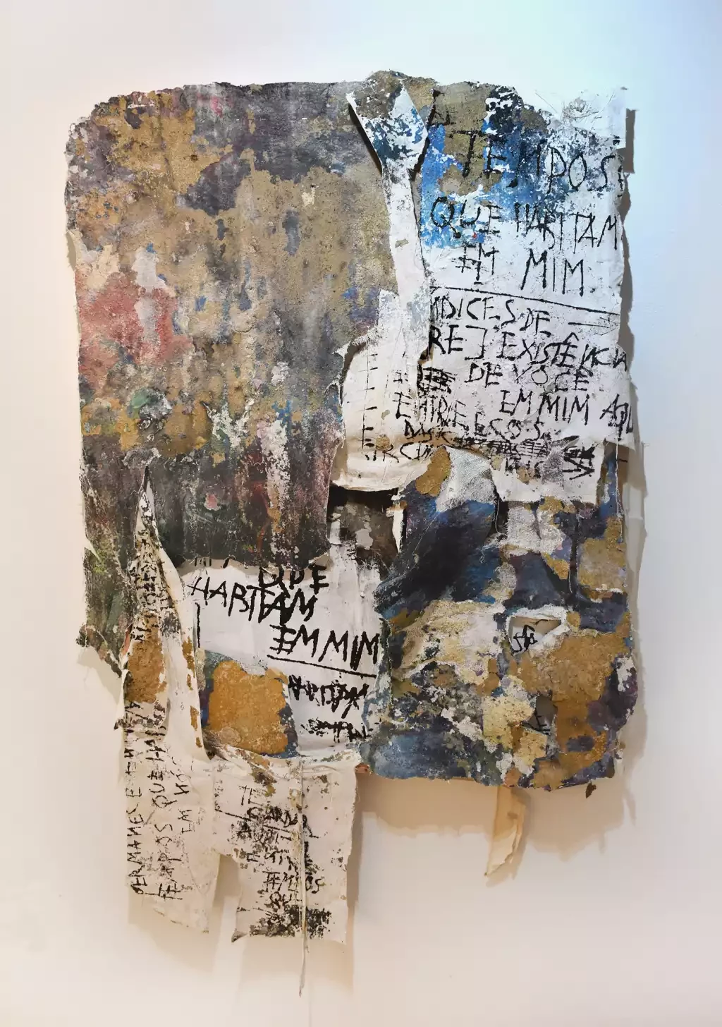Tempos Que Habitam Em Mim ITinta, decollage e monotipia sobre tecido montado sobre chassi160 x 130 cm (aprox.)2022Quadro exposto em 2022 na exposição indivudual "Tempos que Habitam em Mim", Curadoria Loly Demercian. O título escolhido pelo artista Azeite de Leos para essa ex- posição (que tem a intenção de ser uma reavaliação dos últimos 10 anos de sua produção artística) não poderia resumir de melhor forma a questão que permeia toda a sua obra: a impermanência, a tentativa vã do homem de transcender seu tempo e de “deixar uma marca”. Segundo a galerista e historiadora da arte Loly Demercian 2 “Azeite de Leos nesses últimos dez anos, fez uma retomada, uma reestruturação em seu fazer, e olhando para trás, nos trabalhos realizados, foram marcados por um tempo que ali existiu, e, ao questionar a integridade da matéria, trás a tona a nossa própria fragilidade e efemeridade”.O tempo não retrocede, o tempo não avança, apenas é. O tempo existe. Sempre! A infinitude do tempo é o contraponto irônico de todo o desejo do homem de construir algo que perpetue, que não tenha fim. Essa antiga (e eterna) problemática do homem de agir/construir/criar apesar do tempo, parece se manifestar fortemente na pesquisa artística de Leos. Podemos encontrar em toda a sua produção o diálogo estabelecido entre a ação do homem e a ação do tempo. No começo de sua trajetória, a base de sua produção artística estava fundamentada nas intersecções entre desenho e escrita, enquanto manifestações possíveis de ambos no campo do fluxo de pensamento e da criação de narrativas, como explicitado pela artista e pesquisadora Beatriz Rauscher 3 em seu texto “Onde o desenhar coagula” 4 so- bre a obra do artista: “O eixo dos investimentos poéticos de Azeite de Leos está na intersecção entre desenho e escritura. O desenhar é ação fundadora e construtora das micronarrativas criadas por ele, trata-se de um desenhar se fazendo, um desenho fluído e em fluxo”. E se este desenho se manifesta na forma de um fluxo (ou seja, o modo contínuo, o curso constante), cada trabalho poderia então ser percebido como uma forma de registro (registro do pensamento, registro do movimento do corpo, registro de um momento). Portanto, era natural que o artista começasse a se interessar, dentro de sua pesquisa plástica, pelas possibilidades do suporte, por dar um caráter envelhecido ao suporte do de- senho – se o desenhar era o registro da ação do homem, do pensamento, do gesto e, principalmente, de um instante, o suporte, portanto, precisaria “denunciar” a passagem do tempo. [...]
