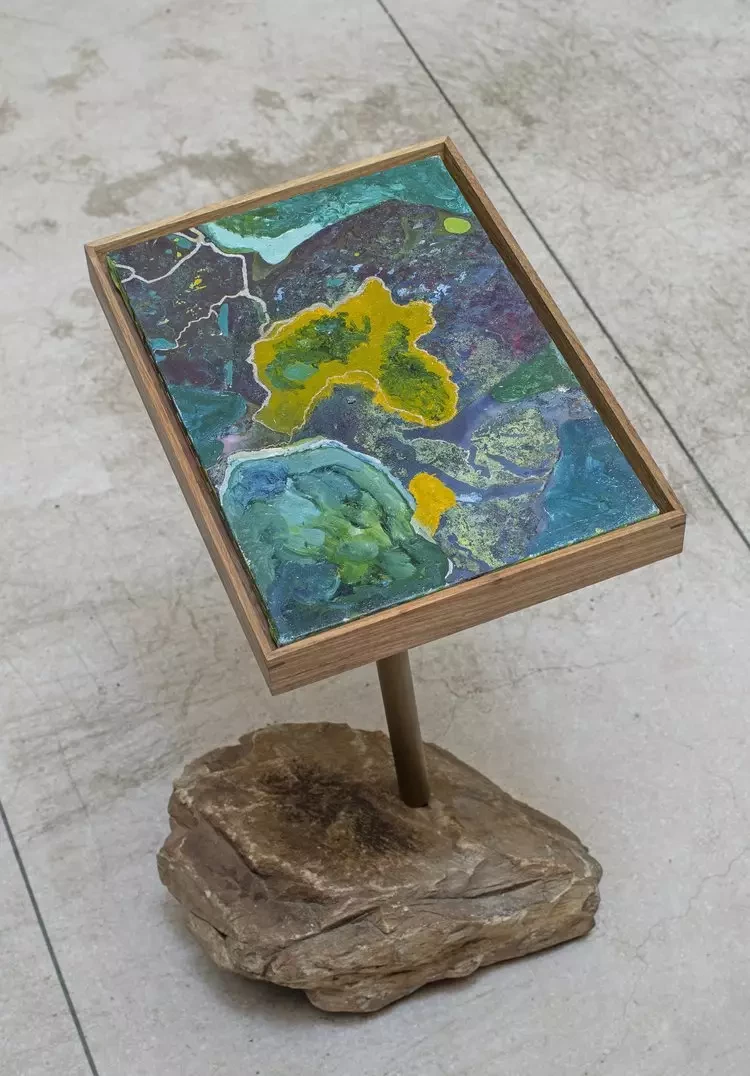 A partir dessa ideia de ter a arte presente nas entranhas da casa, surgiu Pintura Entre Limites, obra central da mostra, composta por um muro construído de camadas pigmentadas de concreto armado. Nela, Luiza imita o processo de sedimentação da geografia natural para produzir uma pintura que não é superficial como um afresco ou mural, mas que é o corpo todo da estrutura.